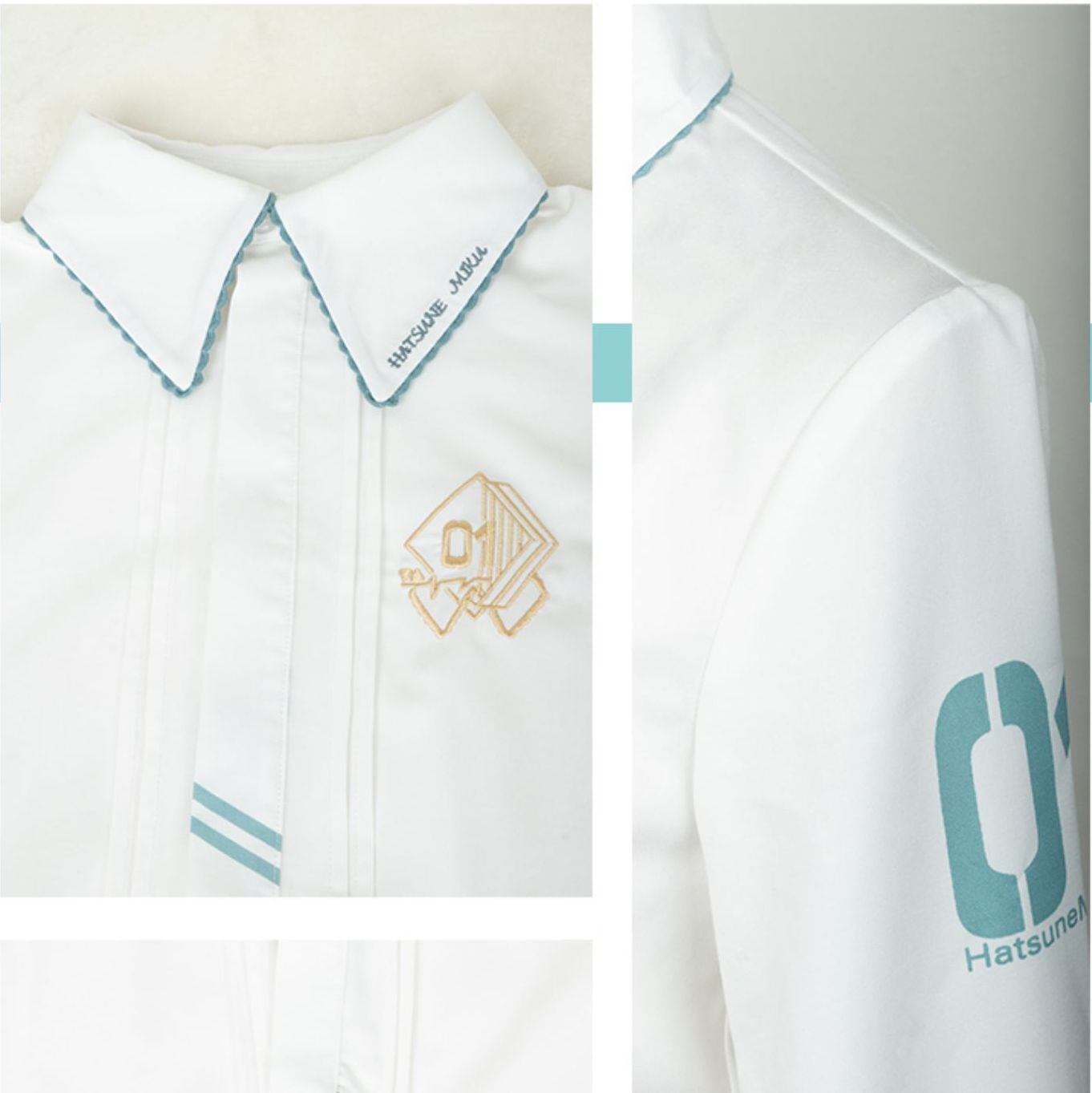 袖や襟、左胸に初音ミクをイメージした刺繍が入っています。